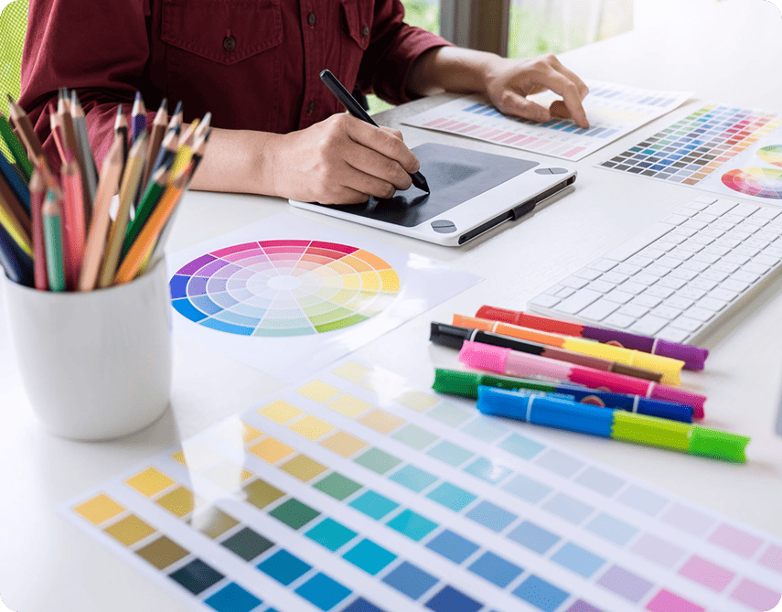 A graphic designer creates logos, advertisements, social media posts, websites, packaging, and other visual materials.
